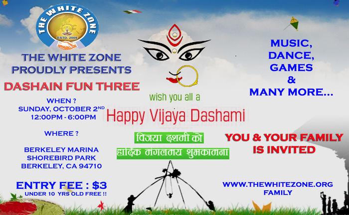 It is our great pleasure to extend a warm invitation to you to attend the"Dashain Fun-THREE" hosted by The White Zone on 2nd OF OCTOBER 2011, Sunday, at Berkeley Marina from 12:00 pm to 5:00 pm.