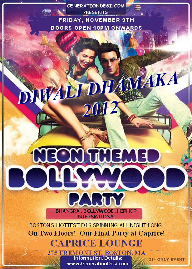 Bringing you the best desi parties in Boston for 8 years! GenerationDesi.com presents Diwali Dhamaka 2012 our yearly Diwali special, one time event at your popular destination through out the year! This time we have something special store for you with newon themed Diwali party. Glow sticks will be given to attendees to celebrate diwali. Our resident DJ Hiti is back by popular demand for one time only at Caprice Lounge in Boston. Address: 275 Tremont St, Boston, MA.