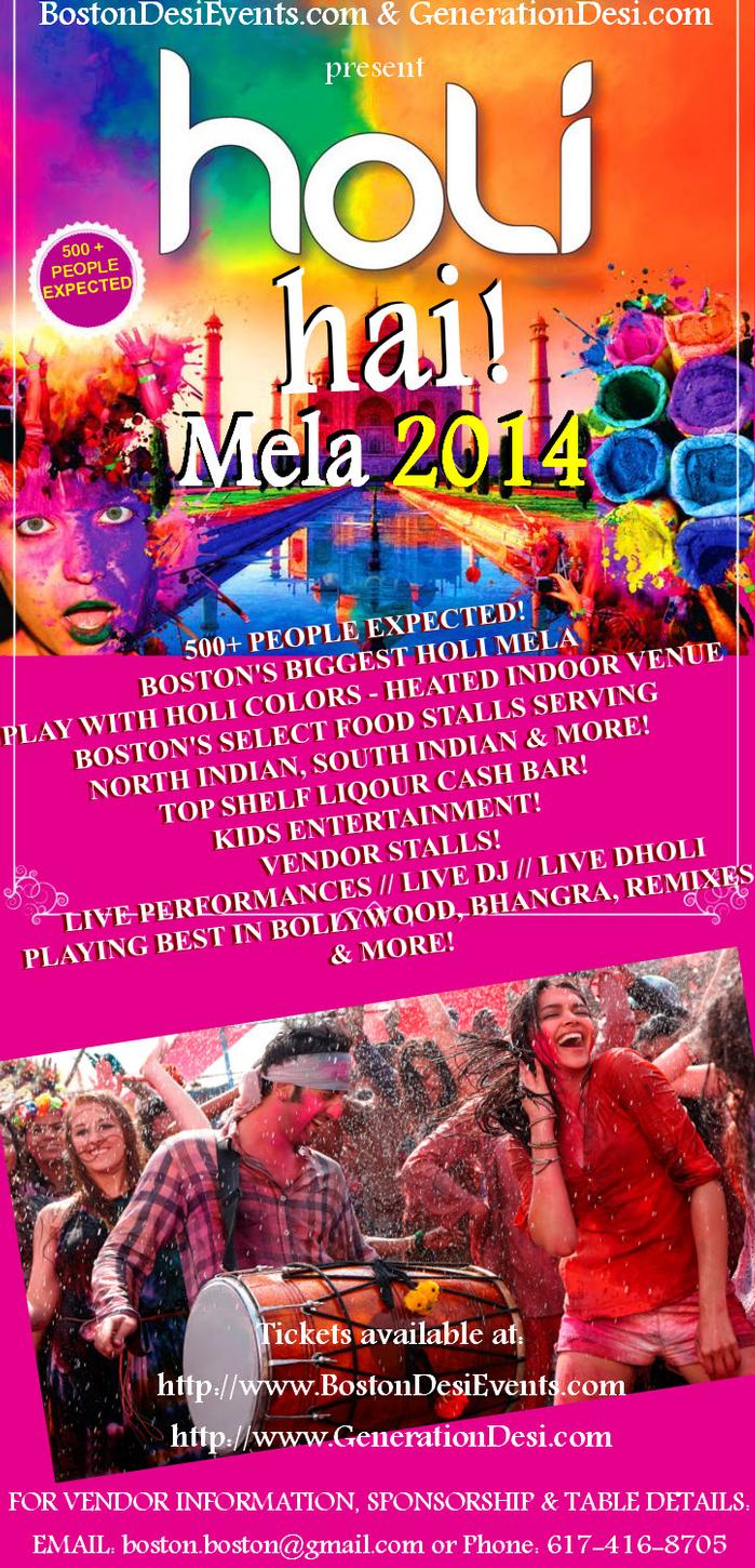 Holi is part of the Indian culture and our memories! It is time to recreate this fun time in Boston!! We brought you the first Holi Hai Mela back in 2004. After finding the perfect venue for Holi, we are doing it again this year! BostonDesiEvents.com in association with GenerationDesi.com bring you Boston Holi Hai Mela 2014! An opportunity to play with Holi colors indoors right in Boston! So come rain, or snow, we are going to celebrate & have a good time. Over 500 plus capacity - right in Boston-Fenway area! Please check BostonDesiEvents.com for any changes on the day of the event! Here are some event details: Holi colors will be included with tickets and will be played in a large venue-indoors! Multiple food stalls: North Indian stall & South Indian stall! Additional vendor stalls, to book your stall, call Ravi: 617-416-8705 Kid's area and kids entertainment. Performances & Activities from 10:30 to 12:30pm (some are listed below): Face painting, Magician, dance & singing and other stage performances and more! Roaming Photographer! All out Holi colors and dance from 1:00pm to 2:30pm! Live DJ playing your favorate Holi and Bollywood songs including Rang Barse, Balam Pichkari, Kaike Paan Banaras and more!! 2 cash bars serving top shelf liquor. LED lights and dance floor! Live Dholi and more!! For additional details, see website: www.BostonDesiEvents.com or GenerationDesi.com. For sponsorship or vendor or table information, email boston.boston, Generationdesi or call Ravi: 617-41-8705. Street parking and plenty of parking lots in the area.