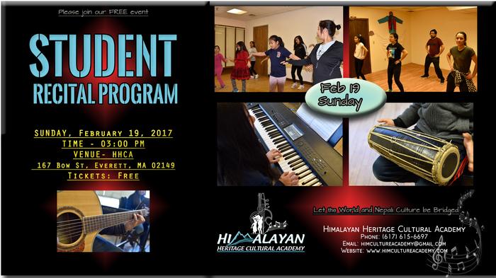 Student Recital Program of Himalayan Heritage Cultural Academy. Admission is FREE. PLEASE ATTEND THE SHOW and bring your friends and families and ENCOURAGE the students. Himalayan heritage cultural academy167 Bow St, Everett, MA 02149 ​Phone: ((617) 615-6697 [email protected]