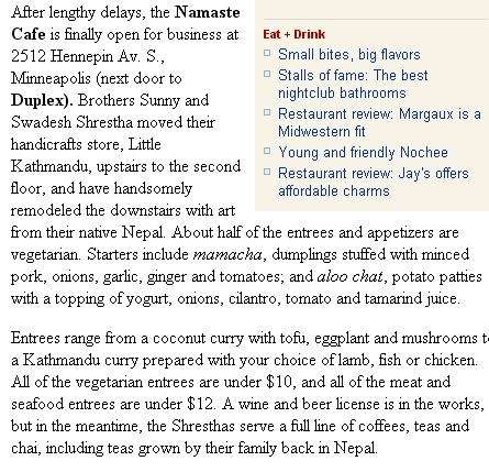 . - http://www.startribune.com/456/story/352612.html After lengthy delays, the Namaste Cafe is finally open for business at 2512 Hennepin Av. S., Minneapolis (next door to Duplex). Brothers Sunny and Swadesh Shrestha moved their handicrafts store, Little Kathmandu, upstairs to the second floor, and have handsomely remodeled the downstairs with art from their native Nepal. About half of the entrees and appetizers are vegetarian. Starters include mamacha, dumplings stuffed with minced pork, onions, garlic, ginger and tomatoes; and aloo chat, potato patties with a topping of yogurt, onions, cilantro, tomato and tamarind juice. - http://www.namastecafe.net