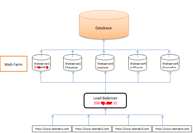 There is a single website setup on IIS. Based on the URL requested, the code pulls the settings from the database and displays website. For example, if the request is domain1.com, the code will pull only setting for domain1 and displays the content on domain1.com. If the request URL is domain2.com, it pulls the setting only for domain2 and displays the content on domain2.com