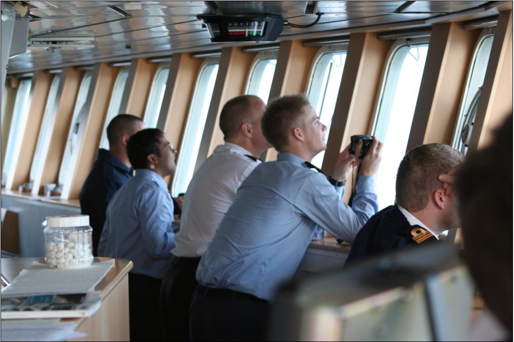 Keeping watch on the other boats from the bridge.