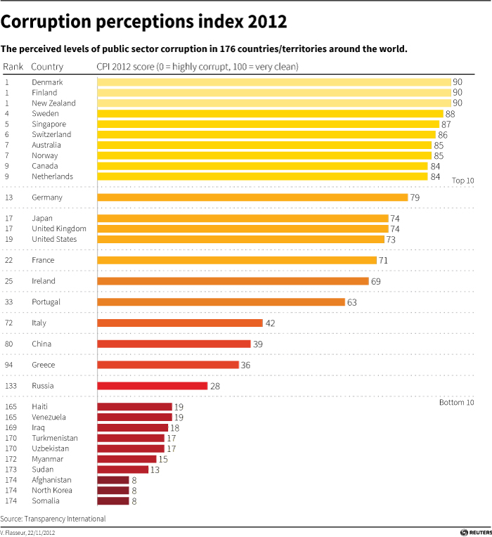 Where is Nepal and India in this list? In the middle portion of the chart...no way! This chart is totally wrong;).I am hoping they got negative scores (0 means highly corrupt but I am assuming they got less than that - may be negative score). That's why they are not listed in this chart. Anyways, interesting chart. Felt like sharing with you guys!