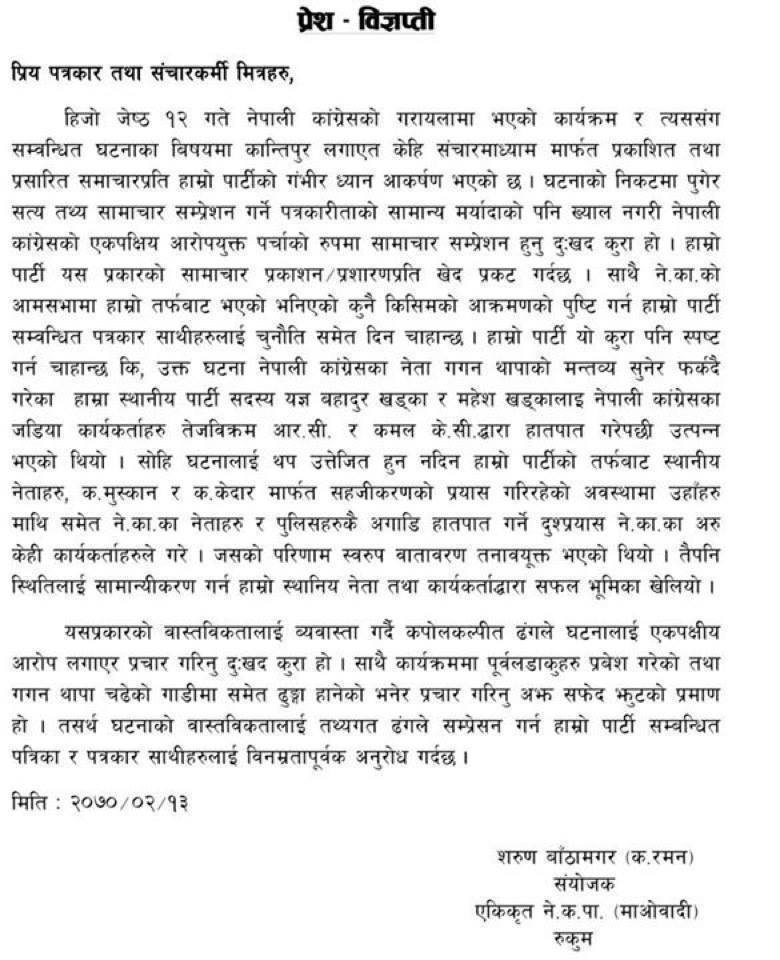 karyakram ma pani upastiti bhayeko thiye, amshava rakhiyeko thiyo rukum ma, muskil le 30 jana sahabhagi thiye, gagan le gali garna thalyo maobadi lai, sayau sthaniya haru, gagan biruddha nara lagaudai k ayeka thiye gagan tap, khyal gara gagan, mao lai gali garne rahar chha bhane ktm bata gara, media le sthan dinechha, kantipur le thula letter le lekhnechha, aringal ko golama gayera, jatha bhavi hirkauna thale pachhi k hunchha, gagan lai jati arulai k thaha