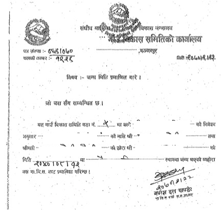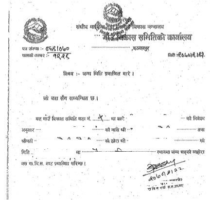 I have attached a copy of my birth certificate that was provided to me from my VDC. Thanks.