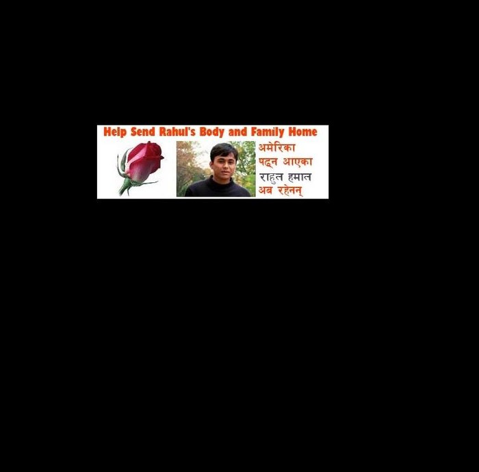 Note: The funds will be collected in Dixant Rai's Paypal account which will be donated to Rahul's family. The Nepali community at Caldwell College requested Dixant Rai to administer the fund as he was an intimate friend of Rahul Hamal. For transparancy , all the transactions of the donations collected will be posted regularly. Your support would be a great help to Rahul's family.Here is the link for donation: http://helprahul.org/ Please join this group on facebook. http://www.facebook.com/group.php?gid=64068586657&ref=nf"The words are endless, word not. Write more I would like to stop I have to but." - Rahul Hamal