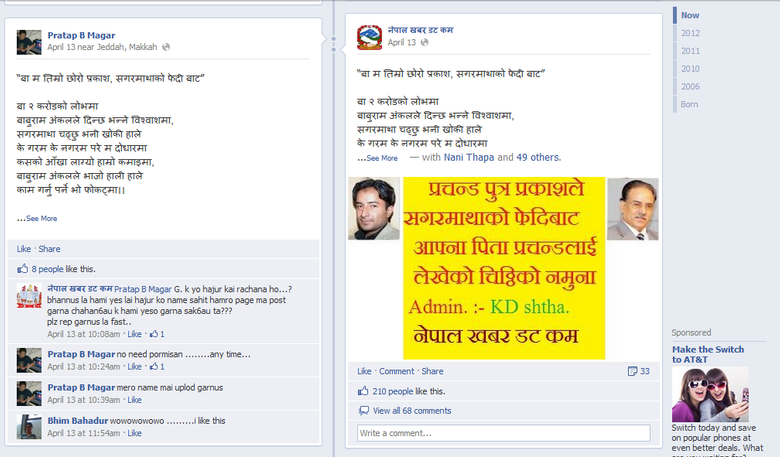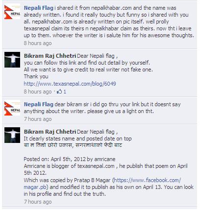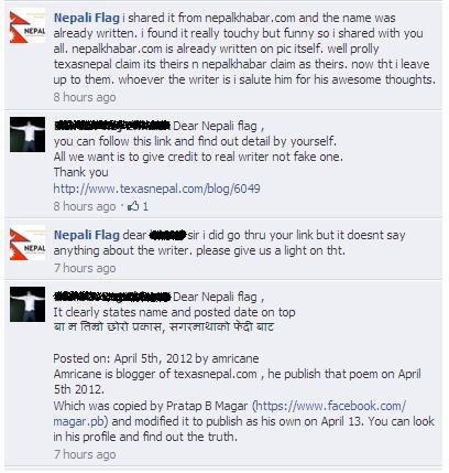 After following this thread by Americane, I wanted to write a response to नेपाल खबर डट कम - but after reading the above comments, it is clear that they want to hold onto the likes and the publicity and the 15 minutes of fame generated by the falsely credited poem. I say this because their comments that I quoted above is clearly fabricated or coming from someone who does not know what sajha.com is, and it would be useless to try to reason with them. The fact of the matter is sajha.com has never made any statements to or about नेपाल खबर डट कम. Sajha.com has never called them a चोर or posted about them in sajha wall or claimed any rights.