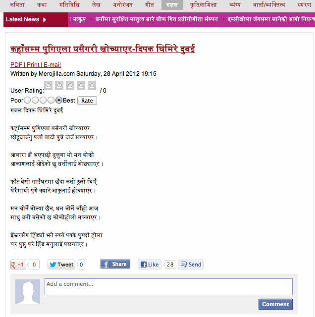 आँफैलाई कवि भन्न खोज्या होइन, तर 'मेरै भात भन्या भात हो' भन्ने टुक्रो एउटा दाजुले यहाँ साझामा भेटेर आफ्नै जसरी फेसबुकमा टाँस्या थिए। रमाइलोको लागि लेख्या भए नि आफ्नो रचना अरुले श्रोत नखुलाई वाह-वाह पाउन प्रयोग गर्या देख्दा अलि खल्लो लाग्छ।