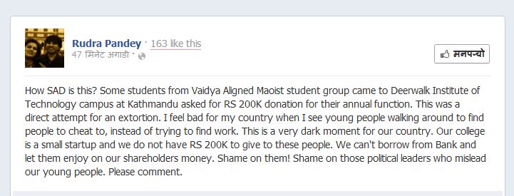 NOTE: The opinions here represent the opinions of the individual posters, and not of Sajha.com. It is not possible for sajha.com to monitor all the postings, since sajha.com merely seeks to provide a cyber location for discussing ideas and concerns related to Nepal and the Nepalis. Please send an email to [email protected] using a valid email address if you want any posting to be considered for deletion. Your request will be handled on a one to one basis. Sajha.com is a service please don't abuse it. - Thanks.