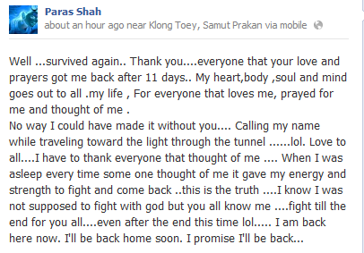 Paras Sarkar thanks everyone who wished him well and also those who didn't wish him well. He realizes that in the past he has not behaved upto everyone's expectations but that he will be a changed man after this near death experience.